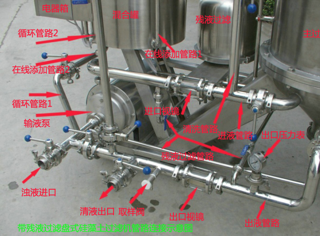 過濾時,首先在過濾盤上形成硅藻土預(yù)涂層。被過濾的液體經(jīng)硅藻土預(yù)涂層時,其中的雜質(zhì)即被阻擋;而純靜的液體經(jīng)過微觀管狀或片狀的間隙以及顆粒之間的間隙通過過濾層,從而起到過濾作用。隨過濾時間的推移,在預(yù)涂層上被濾掉的雜質(zhì)會越來越多,且將阻塞過濾通道。因此在過濾過程中,還需對進入過濾罐的被過濾的液體,添加一定劑量相應(yīng)粒度的硅藻土,以維持正常的過濾過程。另外,如果過濾時需要脫色,還需加入一定比例的活性炭。
